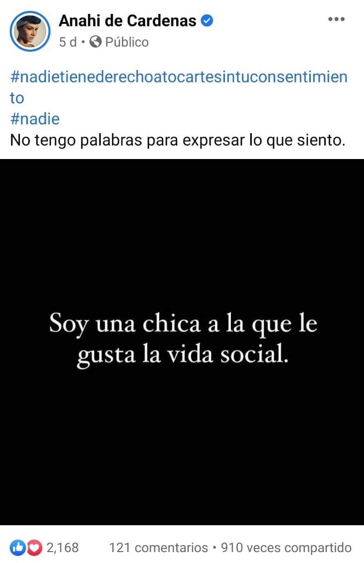 La artista Anahí de Cardenas mostró a través de sus redes sociales el total apoyo a la joven de 21 años violada en el distrito de Surco, con el mensaje "Soy una chica a la que le gusta la vida social".