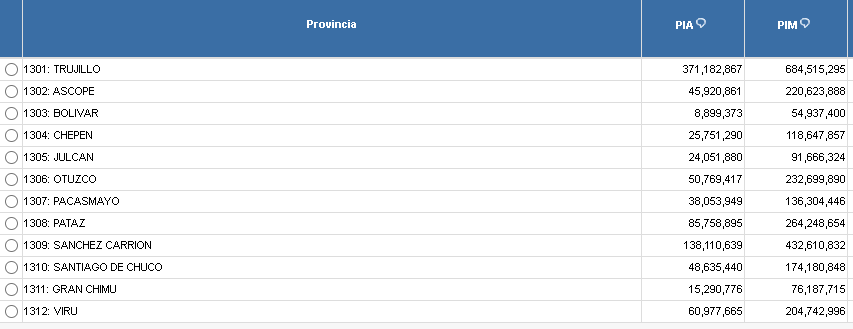 Según el portal de transparencia de la web del Ministerio de Economía, actualmente la Municipalidad Provincial de Trujillo ha recibido un presupuesto redondeado de 261 millones de soles. Al ser la capital de la región de la Libertad, el dinero recibido por el estado es mayor. De igual forma, el avance que se ha logrado en esta provincia es el mayor a comparación de las demás con un 41%, seguido de Pacasmayo con un 38% y el más bajo de todos es Gran Chimú con un 24.2% de avance.