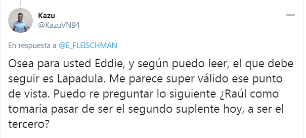 Sin embargo, esta respuesta por parte del periodista deportivo no aclaró las dudas del hincha peruano, el cuál replicó, dando a entender que Fleischman sugiere que Lapadula sea el siguiente titular luego de los jugadores ya mencionados, preguntando nuevamente, como se sentiría Raúl Ruidíaz al pasar de segundo a tercer suplente de ataque en la blanquirroja.