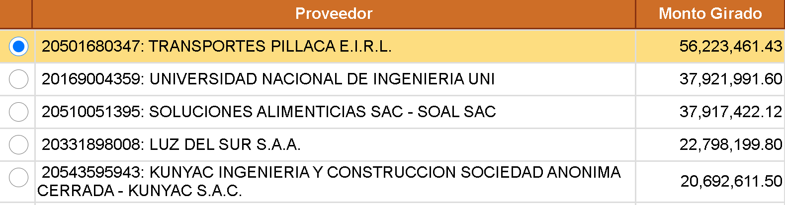 Haciendo un recuento de los proveedores, en primer lugar tenemos a Transportes Pillaca E.I.R.L. el cual ha acumulado s/56, 223,463.43 en 15 años de alquiler en servicio de transporte, ellos empezaron a trabajar desde el 2006 en la entidad edil y continúan hasta el día de hoy. Por otro lado, La Universidad Nacional de Ingeniería acumula s/37, 921,991.60 en 7 años, así mismo, dejaron de prestar el servicio de educación, ensayos, análisis técnicos y demás el año pasado. Aún se discute si el presupuesto fue bien invertido, puesto que el plan para detener los huaycos en las distintas zonas no sirvió. Por otra parte, la empresa Soluciones Alimenticias SAC-SOAL SAC percibió s/ 37, 917,422.12 en 15 años hasta hoy en día, esta inversión está justificada, ya que se trata de productos de primera necesidad. Así mismo, Luz del Sur S.A.A. cuenta con s/22, 798,199.80 en 18 años hasta la actualidad, con un trabajo fundamental en el servicio eléctrico a todo el distrito. Por último tenemos a Kunyac S.A.C. con s/20, 692,611.50 acumulados en 7 años de actividad, prestaron sus servicios desde 2012 al 2018. Cabe destacar que ninguna de las empresas mencionadas anteriormente, presentan alguna deuda u omisión tributaria en la SUNAT. No obstante, es asombroso que algunas empresas hayan permanecido en el tiempo de manera "sorpresiva" hasta el día de hoy como si una fuerza los abrazara.